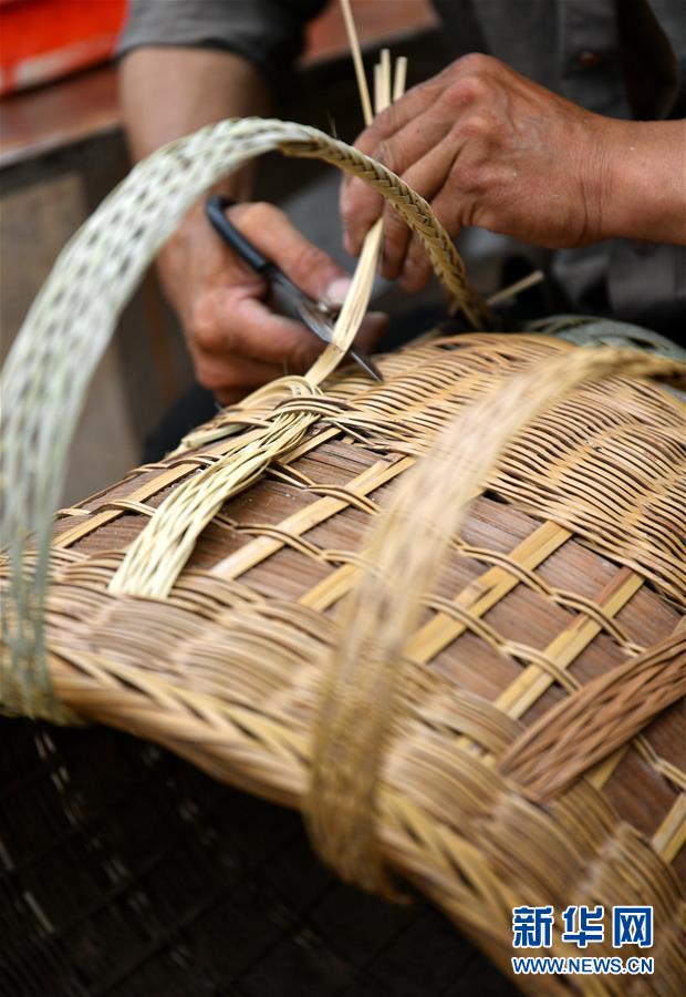 6月11日,在湖北省宣恩县城民族路,篾匠黄明在维修竹背篓。 湖北省宣恩县是土家族、苗族、侗族等少数民族聚居区,竹制的背篓、箩筐、簸箕等用品与群众生产生活息息相关。人们或购买篾匠们精心编织的“篾货(当地人对竹篾制品的统称)”,或花上三五元钱对“篾货”进行修理后继续使用。在宣恩县,传承着湖北省非物质文化遗产“宣恩竹编”技艺的手艺人,用灵巧的双手为当地居民提供服务,满足百姓订做、维修竹篾制品的需要,成为当地一道独特的风景。 新华社发(宋文 摄)