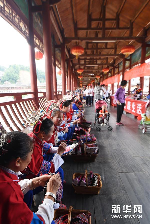 6月11日,绣娘们在贵州省锦屏县三江镇赤溪坪风雨桥进行刺绣技艺展示。新华社发(杨晓海 摄)