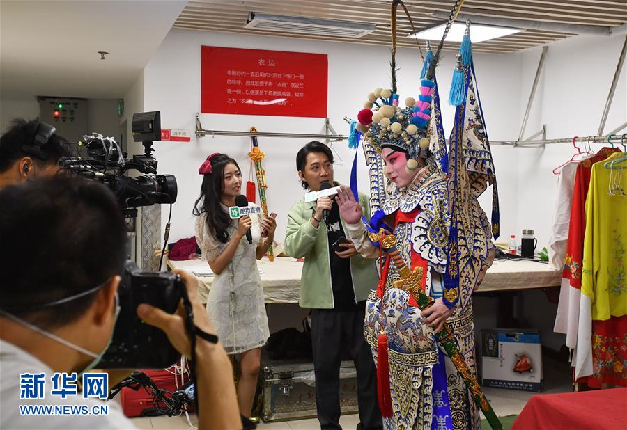 6月12日,直播工作人员探访广东粤剧院后台。 当日,广东粤剧院联合酷狗网络直播平台推出“周末睇大戏(线上版)”,将线下剧场转移到线上,在酷狗直播间里呈现粤剧的经典剧目,为剧迷们打造一场“云端”盛宴。 新华社记者 刘大伟 摄