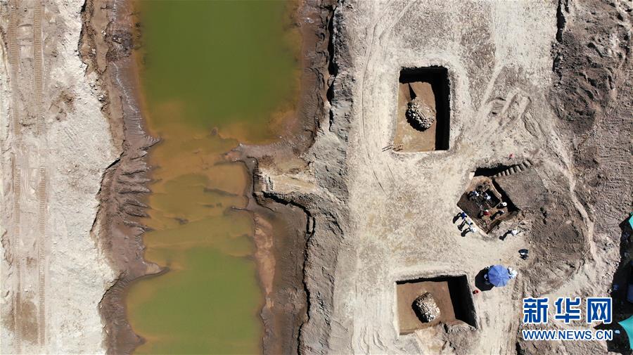 这是6月14日拍摄的山东小清河章丘段考古发掘现场(无人机照片)。 近日,济南市考古研究所考古工作队在对小清河章丘段进行考古调查和勘探时,发现了13座年代集中在北朝末期至唐朝初期的古墓。 新华社记者 王凯 摄
