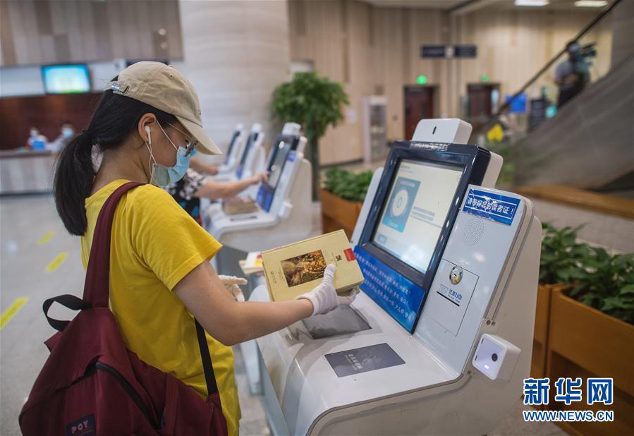 6月14日,在湖北省图书馆,市民归还借阅的书籍。 当日,湖北省博物馆、省图书馆、辛亥革命武昌起义纪念馆、湖北美术馆、省群艺馆五家省级公共文化场馆恢复开放,社会公众可通过预约方式有序进馆参观。 据悉,五家恢复开放的省级公共文化场馆已于日前公布预约方式和限流人数。6月13日零时起,湖北省突发公共卫生应急响应级别由二级调整为三级,并相应调整优化有关防控措施。湖北省省级公共文化场馆的恢复开放,对常态化疫情防控进入新阶段后推动复工复产具有标志性意义,有助于全面恢复生活生产秩序。 新华社记者肖艺九摄
