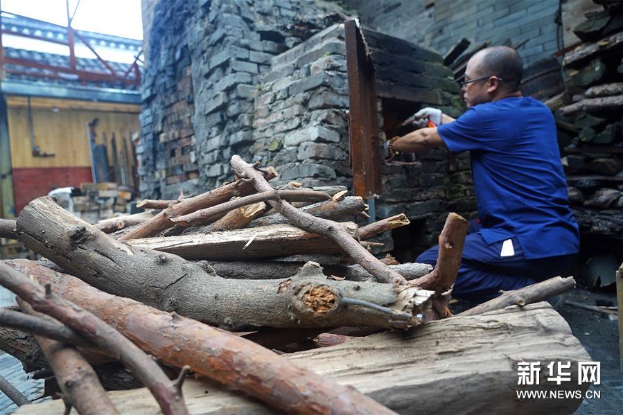 在位于江西吉安县城的制瓷工坊里,伍映山正在用传统方法烧制木叶盏(6月10日摄)。新华社记者 万象 摄