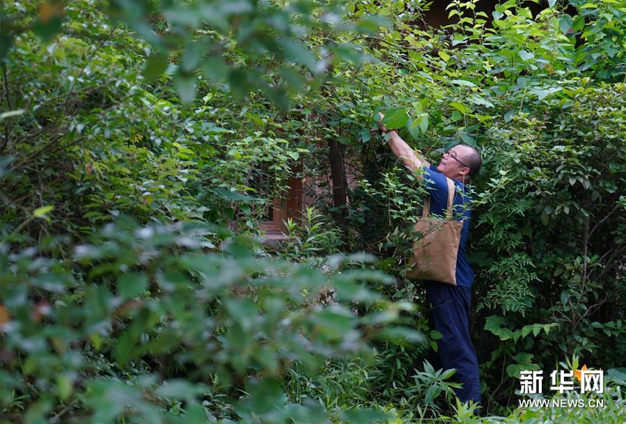 在位于江西吉安县城的制瓷工坊附近,伍映山在选摘制作木叶盏的桑叶(6月10日摄)。新华社记者 胡晨欢 摄
