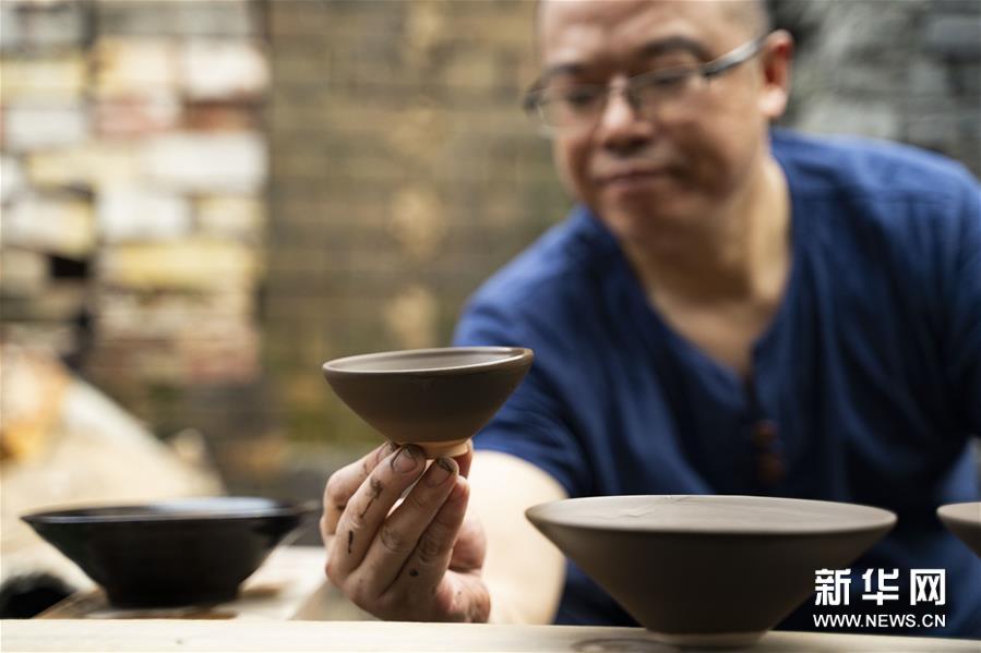 伍映山在位于江西吉安县城的制瓷工坊里摆放上完釉的瓷坯(6月9日摄)。新华社记者 张浩波 摄