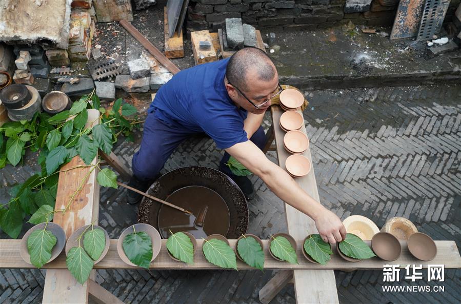在位于江西吉安县城的制瓷工坊里,伍映山将桑叶放置在瓷坯内,准备一起放入窑内烧制(6月9日摄)。新华社记者 胡晨欢 摄