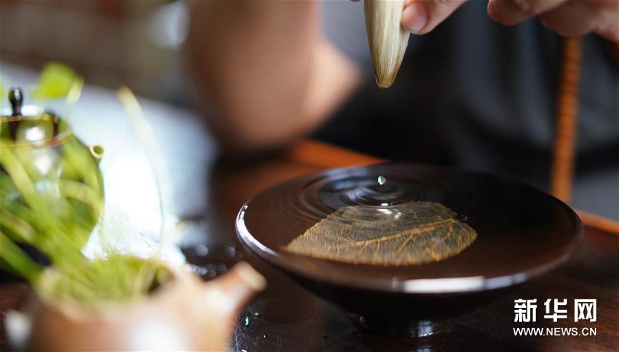 在位于江西吉安县城的制瓷工坊里,伍映山给访客展示一件木叶盏作品(6月10日摄)。新华社记者 胡晨欢 摄