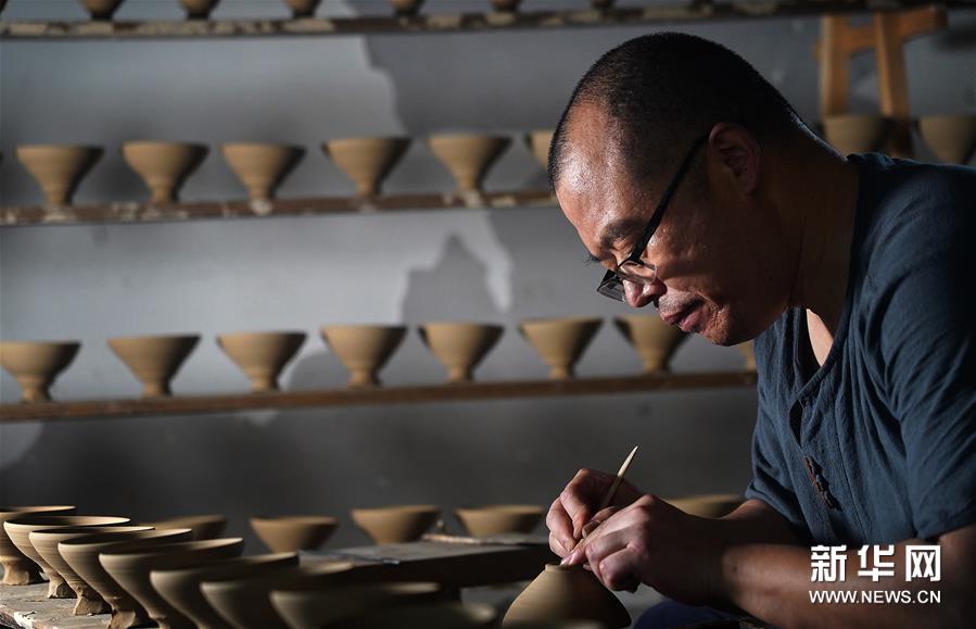 在位于江西吉安县城的制瓷工坊里,伍映山正在制作木叶盏的瓷坯(6月10日摄)。新华社记者 万象 摄