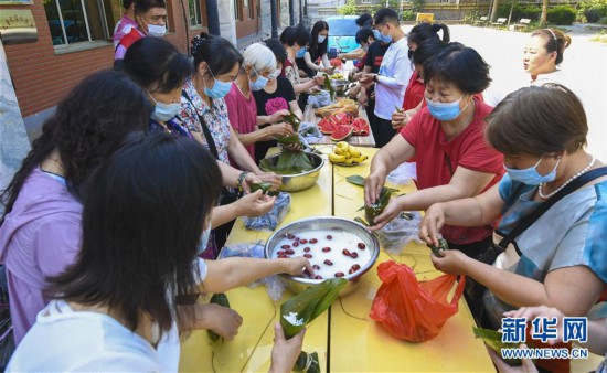 6月22日,志愿者在河北省武强县迎宾社区包粽子。 当日,河北省武强县迎宾社区联合武强县画乡志愿者协会开展“包粽子 迎端午”活动,传承传统文化,增进邻里感情。 新华社记者 李晓果 摄