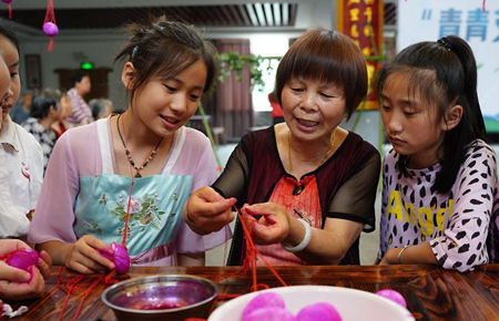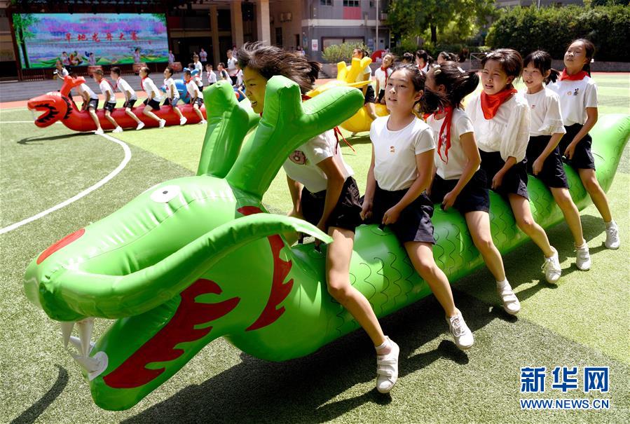 6月24日,西安市新城区后宰门小学的学生在进行旱地龙舟比赛。 端午节临近,各地举行包粽子、做香包、赛龙舟等丰富多彩的民俗文化活动,迎接传统佳节的到来。 新华社记者 刘潇 摄