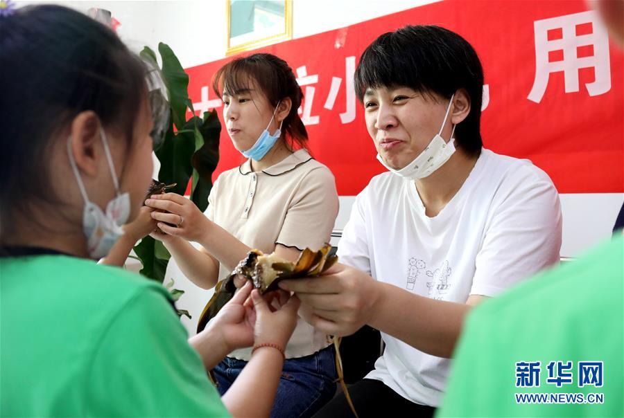 6月24日,在河北省廊坊市安次区西小街社区活动中心,孩子们将亲手包制的粽子送给母亲品尝。 端午节临近,各地举行包粽子、做香包、赛龙舟等丰富多彩的民俗文化活动,迎接传统佳节的到来。 新华社记者 王晓 摄