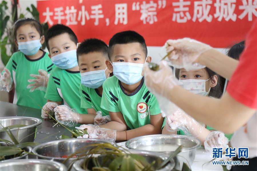 6月24日,在河北省廊坊市安次区西小街社区活动中心,孩子们学习包粽子。 端午节临近,各地举行包粽子、做香包、赛龙舟等丰富多彩的民俗文化活动,迎接传统佳节的到来。 新华社记者 王晓 摄