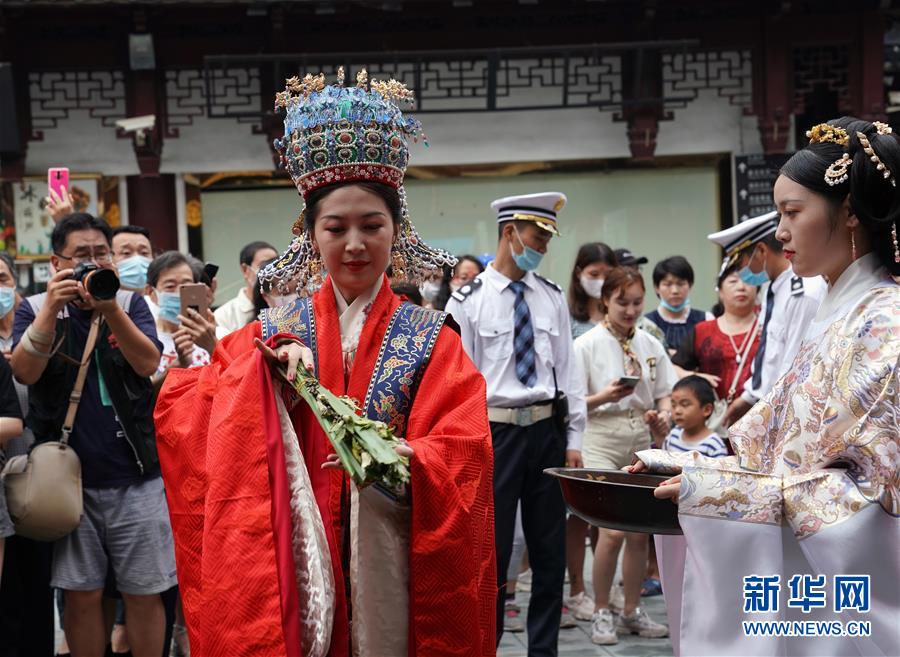 6月24日,在上海豫园举办的端午花神国风庙会上,身着古装的演员在表演。 端午节临近,各地举行包粽子、做香包、赛龙舟等丰富多彩的民俗文化活动,迎接传统佳节的到来。 新华社记者 刘颖 摄