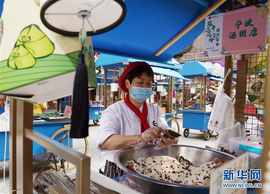 6月24日,在上海豫园举办的端午花神国风庙会上,老字号宁波汤团店的师傅在包制传统的“枕头粽”。 端午节临近,各地举行包粽子、做香包、赛龙舟等丰富多彩的民俗文化活动,迎接传统佳节的到来。 新华社记者 刘颖 摄