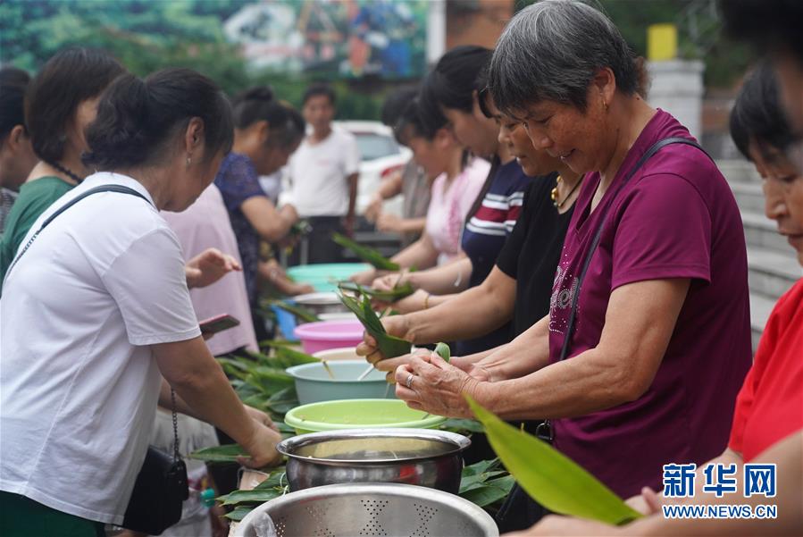6月24日,南昌市湾里区站前街道文明北路社区的居民在广场上参加包粽子比赛。 端午节临近,各地举行包粽子、做香包、赛龙舟等丰富多彩的民俗文化活动,迎接传统佳节的到来。 新华社记者 万象 摄