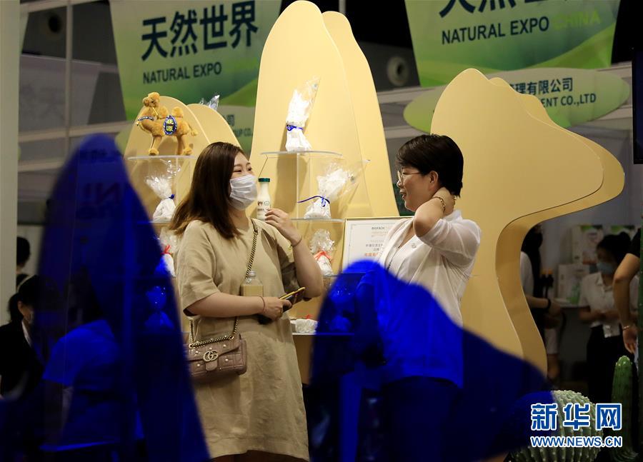 7月2日,参观者(左)与展方工作人员在展台边交流。 7月1日,2020中国国际有机产品博览会在上海世博展览馆开幕,国内外200余家有机产品生产制造企业参展。 新华社记者 方喆 摄