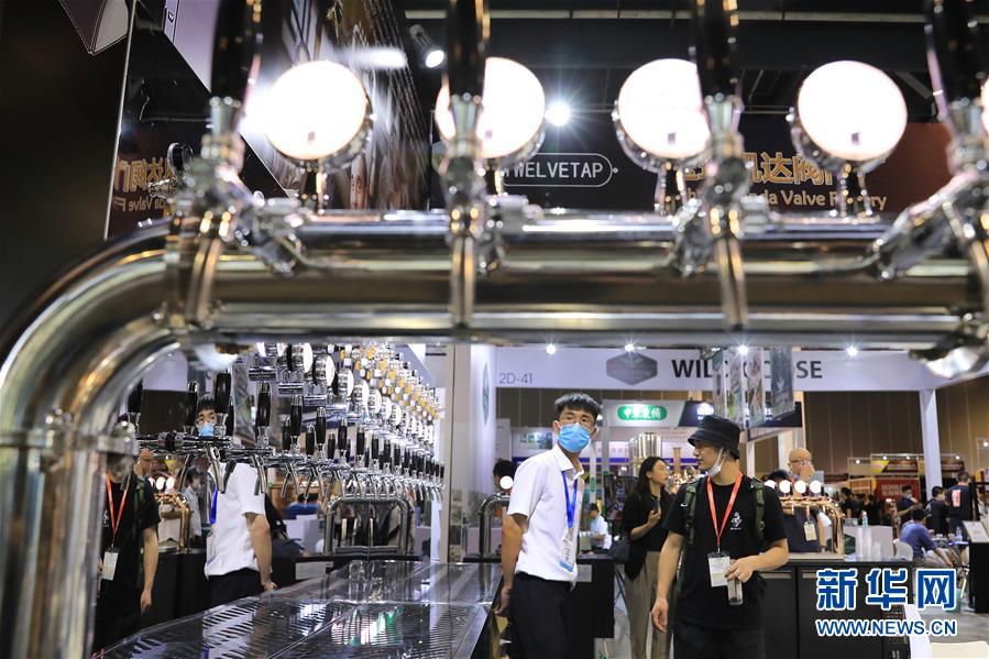 7月2日,展方工作人员(前左)向参观者介绍一组啤酒用阀门展品。 7月1日,2020中国国际有机产品博览会在上海世博展览馆开幕,国内外200余家有机产品生产制造企业参展。 新华社记者 方喆 摄