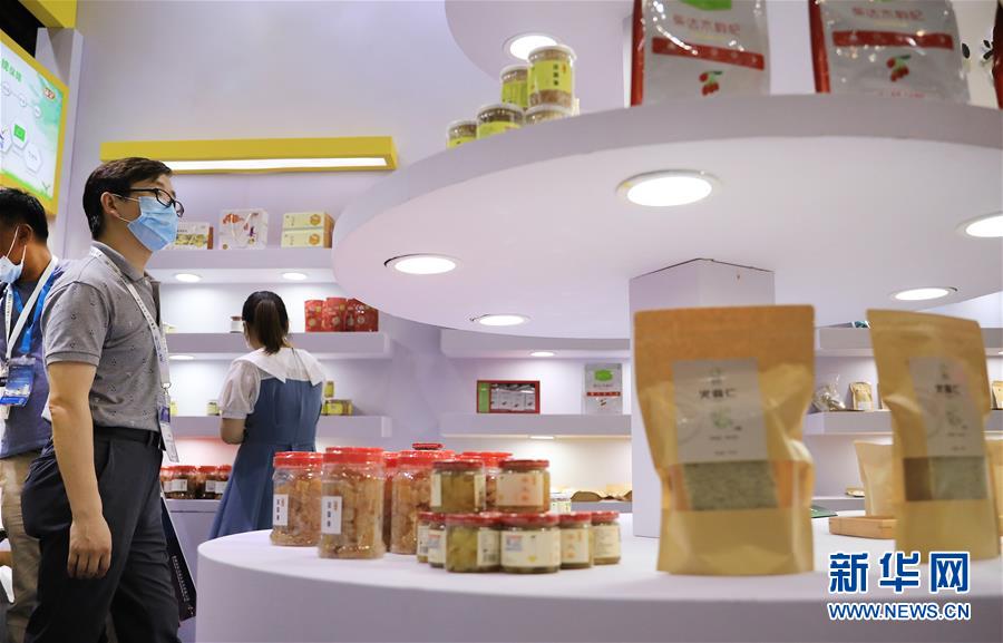 7月2日,参观者走过一个有机食品展示台。 7月1日,2020中国国际有机产品博览会在上海世博展览馆开幕,国内外200余家有机产品生产制造企业参展。 新华社记者 方喆 摄