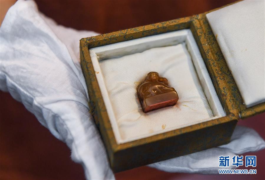 7月2日,在浙江省博物馆孤山馆区捐赠现场,工作人员在介绍“铭心绝品”田黄印。新华社记者 徐昱 摄