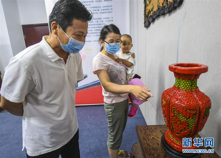 7月4日,人们在廊坊市群艺馆参观雕漆工艺品。 为促进非物质文化遗产的保护、传承和发展,河北省廊坊市在市群艺馆设立非遗展厅展示“燕京八绝”等非遗展品,展现非遗传承人的高超技艺,同时让群众近距离领略非遗魅力。 新华社记者 李晓果 摄