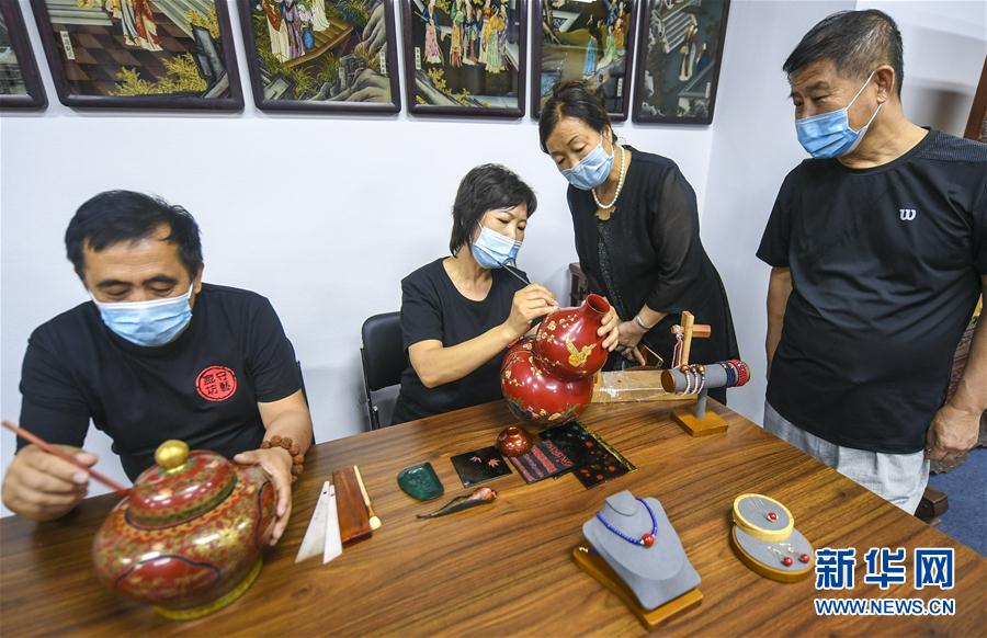 7月4日,省级非遗传承人许晓芳(左二)在廊坊市群艺馆展示金漆镶嵌工艺品。 为促进非物质文化遗产的保护、传承和发展,河北省廊坊市在市群艺馆设立非遗展厅展示“燕京八绝”等非遗展品,展现非遗传承人的高超技艺,同时让群众近距离领略非遗魅力。 新华社记者 李晓果 摄