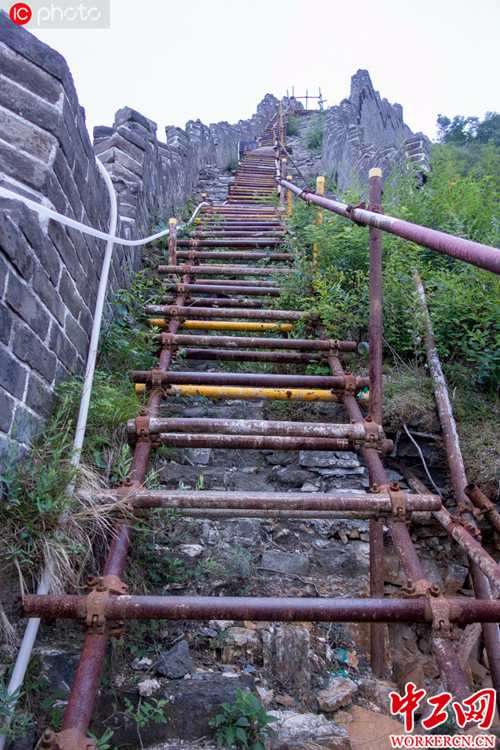 2020年7月5日,喜峰口长城潘家口段大规模修复正在进行。此处长城坍塌严重,从水中一直跃升山巅,由于险峻异常,修复脚手架如同天梯。用船运来的大青砖,摆放在潘家口水库岸边。(本组图片来源东方IC,版权作品,请勿转载。)