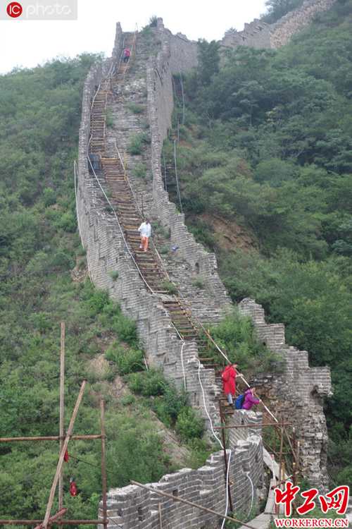 2020年7月5日,喜峰口长城潘家口段大规模修复正在进行。此处长城坍塌严重,从水中一直跃升山巅,由于险峻异常,修复脚手架如同天梯。用船运来的大青砖,摆放在潘家口水库岸边。(本组图片来源东方IC,版权作品,请勿转载。)