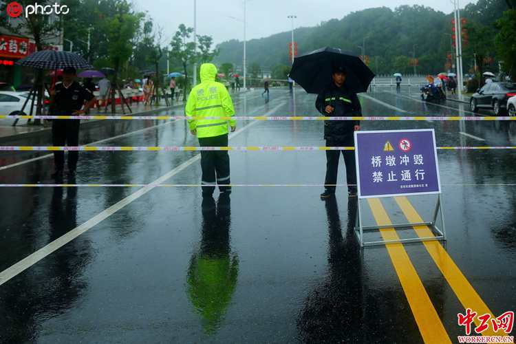 2020年7月7日上午,安徽省黄山市屯溪镇海桥被洪水冲毁,大桥沿线道路实行了交通管制。(本组图片来源东方IC,版权作品,请勿转载。)