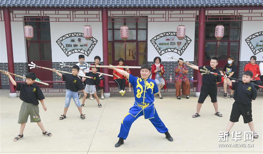 7月8日,在文安县苏桥镇农工村新时代文明实践站,非遗苏桥飞叉艺人在教孩子们练习飞叉。新华社记者 李晓果 摄