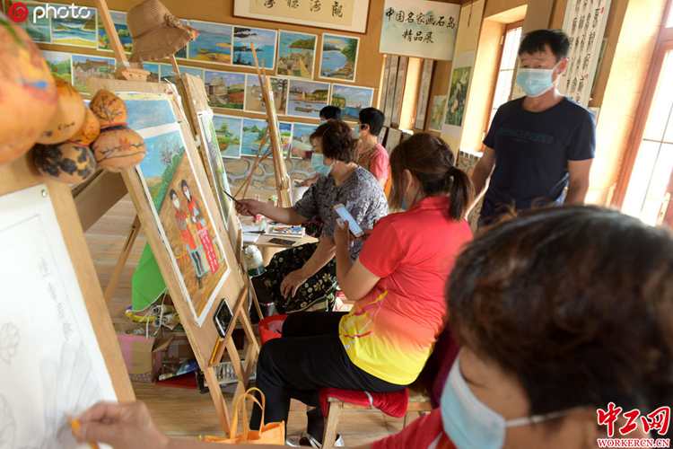 2020年7月8日,山东省荣成市石岛管理区港湾街道牧云庵村,渔家妇女正在画家乡海草房民居,受到游客青睐。港湾街道牧云庵村有300多户人家,从古至今以打渔为生。该村历史上就有崇尚绘画的传统,渔民画作富有北方渔家画的特色。在扶贫攻坚中,港湾街道采取培训,聘请名家指导、写生,引导闲暇渔民学习刀笔画。同时,根据画家不同需求,打造民风创作室、书画展示营销大厅、文房四宝一条街等设施。通过互联网把渔民书画打入电商平台,同时渔民画家现场作画,以独特的渔村画风格受到游客青睐。渔民书画让画村牧云庵走出小天地、打开了大市场。(本组图片来源东方IC,版权作品,请勿转载。)