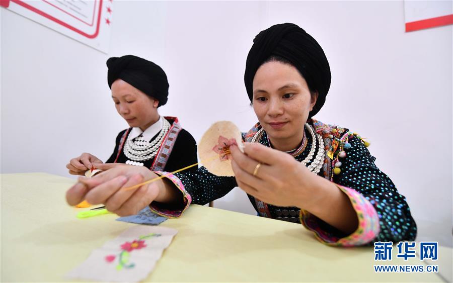 7月9日,在广西融水苗族自治县同练瑶族乡民族广场,瑶族妇女在培训班上学习刺绣。 新华社记者 黄孝邦 摄