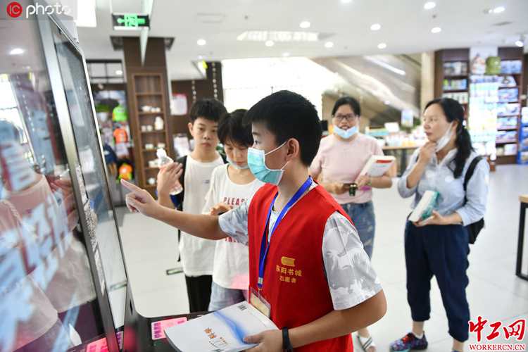 2020年7月13日,浙江省东阳市新华书店内“少年店长”在忙碌工作中。为给中学生提供一个体验职业角色的舞台,体会工作与劳动的意义,浙江省东阳市新华书店推出“少年店长”实践活动,吸引了众多学生报名参加,通过整理书籍、为读者找书、引导读者文明阅读等,实践书城的日常工作,锻炼自我,丰富暑期生活。(本组图片来源东方IC,版权作品,请勿转载。)