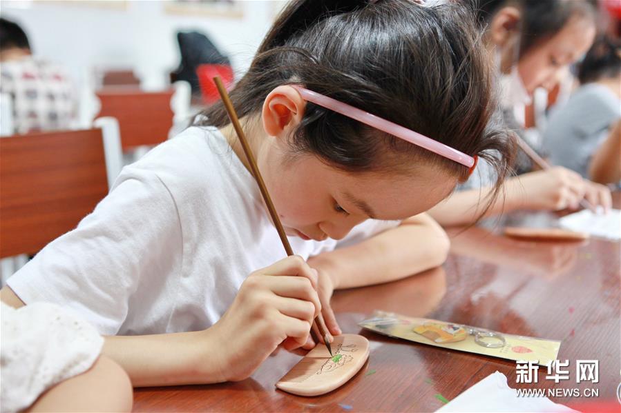 7月14日,小学生在老师的指点下体验木梳制作中的描绘工序。新华社发(史康 摄)