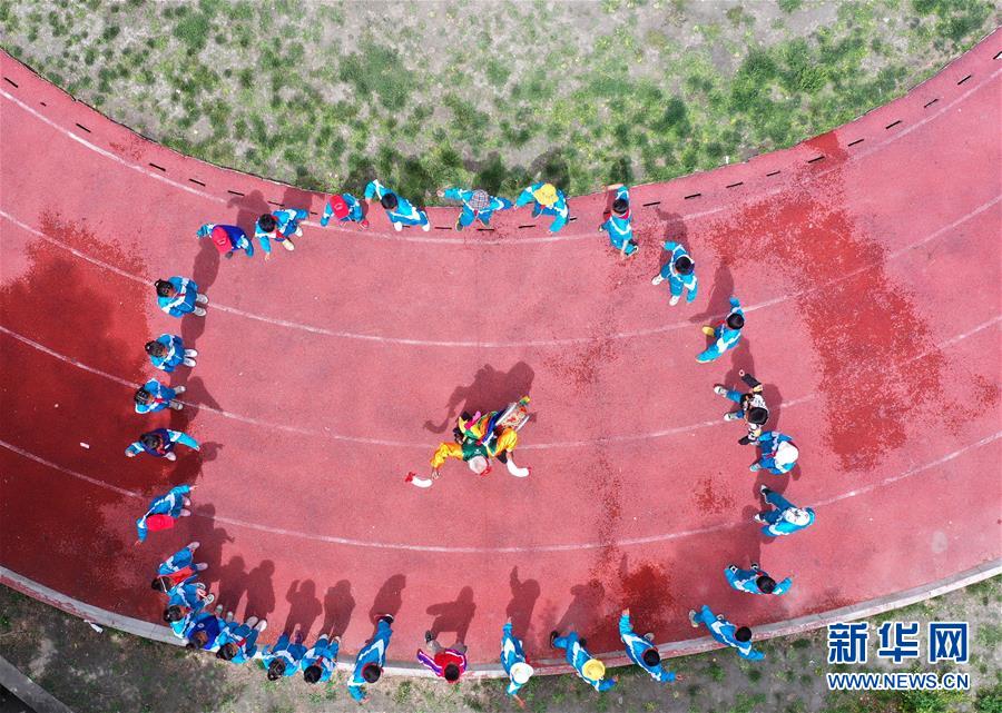 “久河卓舞”传承人尼玛在琼结县下水乡小学进行教学表演(7月2日摄,无人机照片)。新华社记者 詹彦 摄