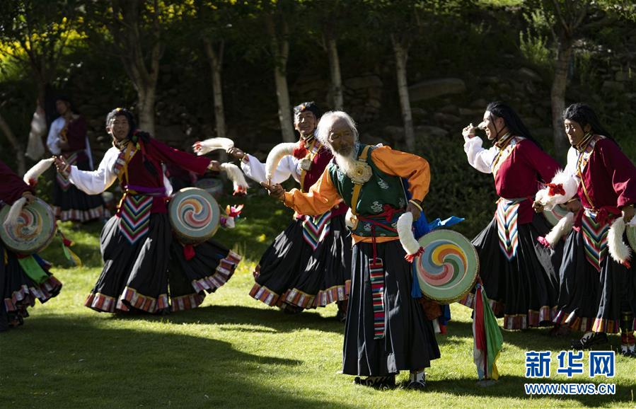 尼玛(中)和弟子们正在表演“久河卓舞”(7月1日摄)。新华社记者 普布扎西 摄