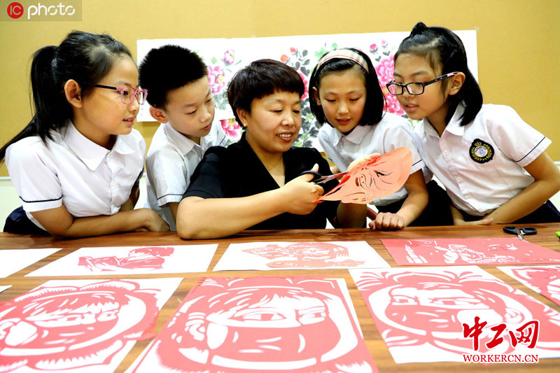 2020年7月17日,河北省邢台市平乡县县直第三小学的小学生正在学习剪纸艺术。范钦龙/IC photo