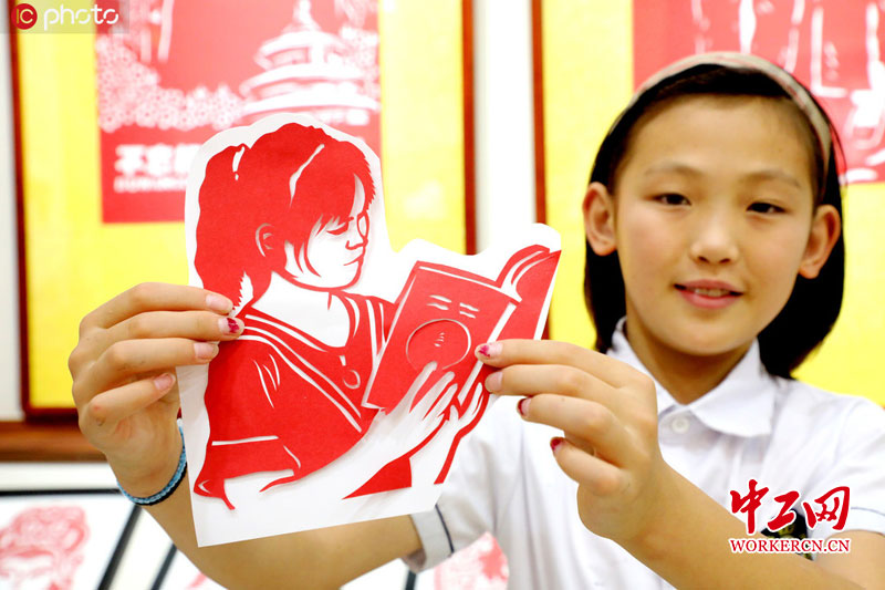 2020年7月17日,河北省邢台市平乡县县直第三小学的小学生展示自己剪的剪纸作品。范钦龙/IC photo