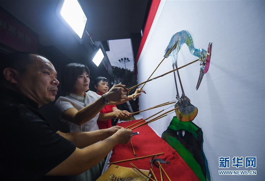 7月21日,“卫家班皮影戏”剧团的艺人们在和睦桥村的文化礼堂前为村民们上演传统皮影戏《鹬蚌相争 渔人得利》。 新华社记者 徐昱 摄