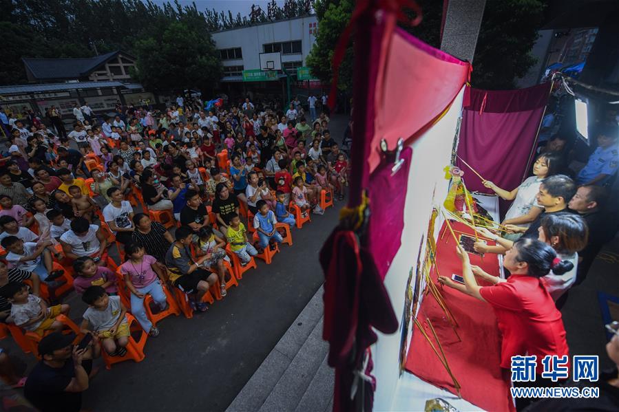 7月21日,和睦桥村的村民们在文化礼堂观看皮影戏表演。 新华社记者 徐昱 摄