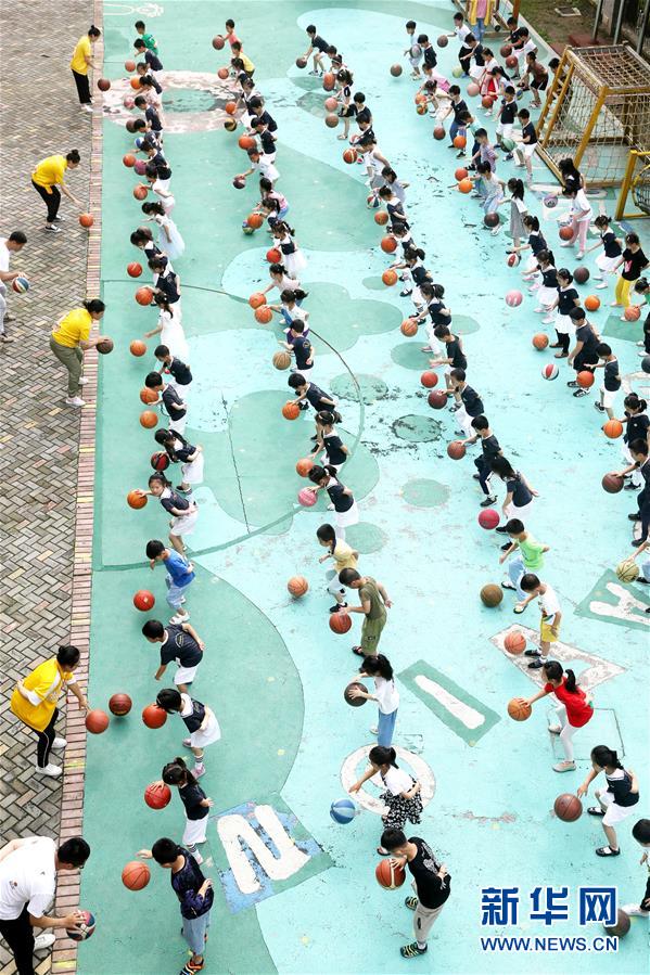 7月21日,江苏省连云港市久和幼儿园的小朋友参加篮球操比赛。 暑期来临,各地少年儿童积极参与各种形式的文化娱乐、强身健体活动,乐享多彩假期。 新华社发(王春 摄)