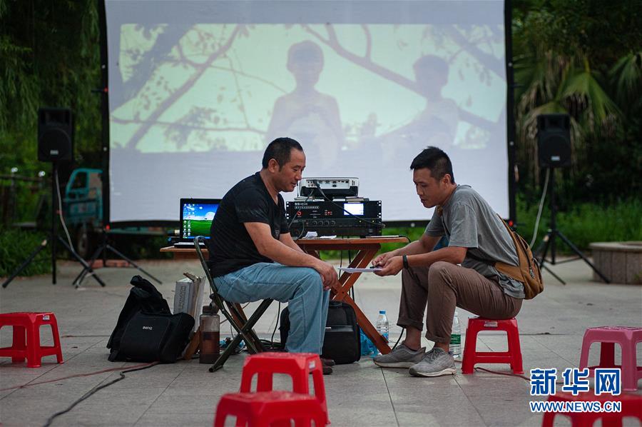 7月23日,在福建省南平市建阳区莒口镇,公益电影放映员兰建松(左)与助手对当晚放映的电影进行排片。 7月以来,福建省南平市建阳区重启文化惠民公益项目,陆续恢复全区公益电影放映活动,并利用播放电影的时机向群众宣传社会主义核心价值观、防疫防控常识、防诈骗技巧等公共政策知识,让乡村的夜晚“有声有色”。 新华社发(伊凡 摄)