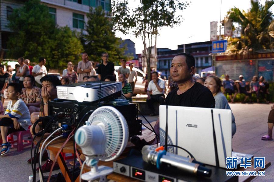 7月23日,在福建省南平市建阳区莒口镇,公益电影放映员兰建松(右前)和村民一起观看电影。 7月以来,福建省南平市建阳区重启文化惠民公益项目,陆续恢复全区公益电影放映活动,并利用播放电影的时机向群众宣传社会主义核心价值观、防疫防控常识、防诈骗技巧等公共政策知识,让乡村的夜晚“有声有色”。 新华社发(伊凡 摄)