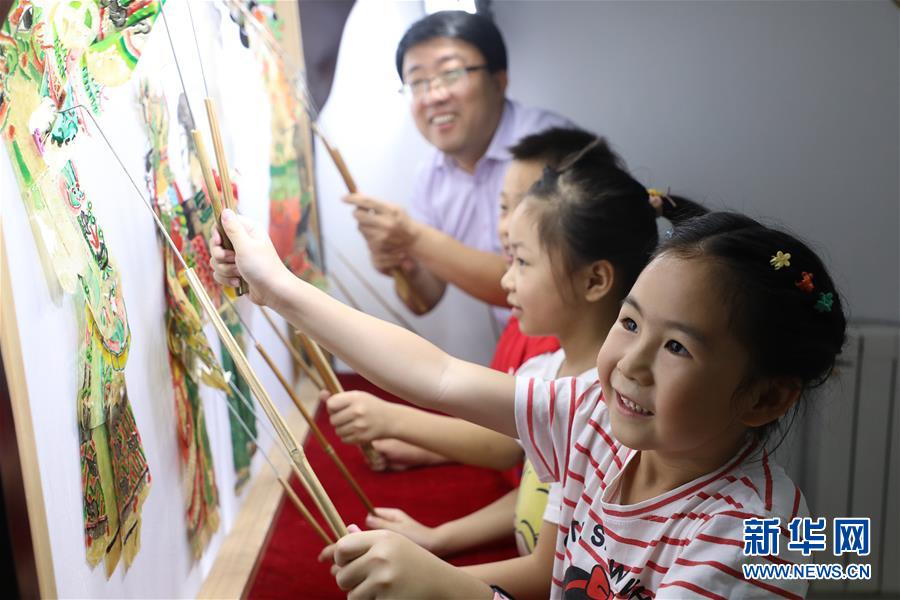7月27日,皮影传承人周学军在“非遗”小课堂指导孩子们表演皮影戏。