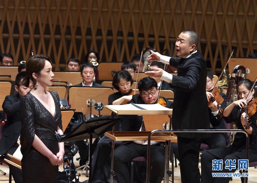 7月29日晚,作曲家谭盾(前右)在2020上海夏季音乐节闭幕音乐会上指挥。 新华社记者 任珑 摄