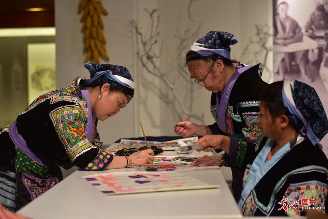 2020年7月28日,贵州省龙里县洗马镇平坡村苗族绘画展在贵阳孔学堂艺文馆开展,展览展出平坡苗画作品100余幅。平坡苗画大多源于平坡村苗族妇女之手,作品以抽象的形式,集中展现了当地苗族的古老传说、民间故事等内容,用苗族妇女独特的审美和绘画技艺创作出的农民艺术品。(龙毅摄/光明图片)