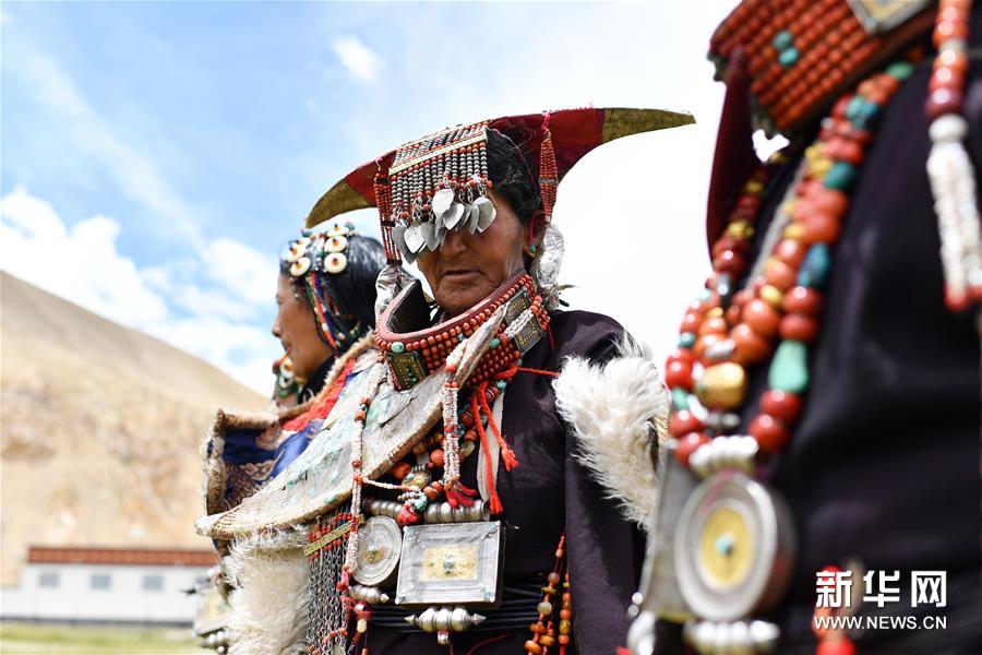 在西藏阿里地区普兰县科迦村,村民在展示普兰服饰(7月28日摄)。在西藏阿里地区普兰县,至今保留着独特的藏族服饰——普兰服饰。据了解,普兰服饰已有1000多年的历史,其中最精美、最独特的是妇女的“孔雀”服饰,一套重达20多公斤,装饰有黄金、白银、蜜蜡、珊瑚、绿松石等,堪称“穿在身上的千年历史”。新华社记者 詹彦 摄