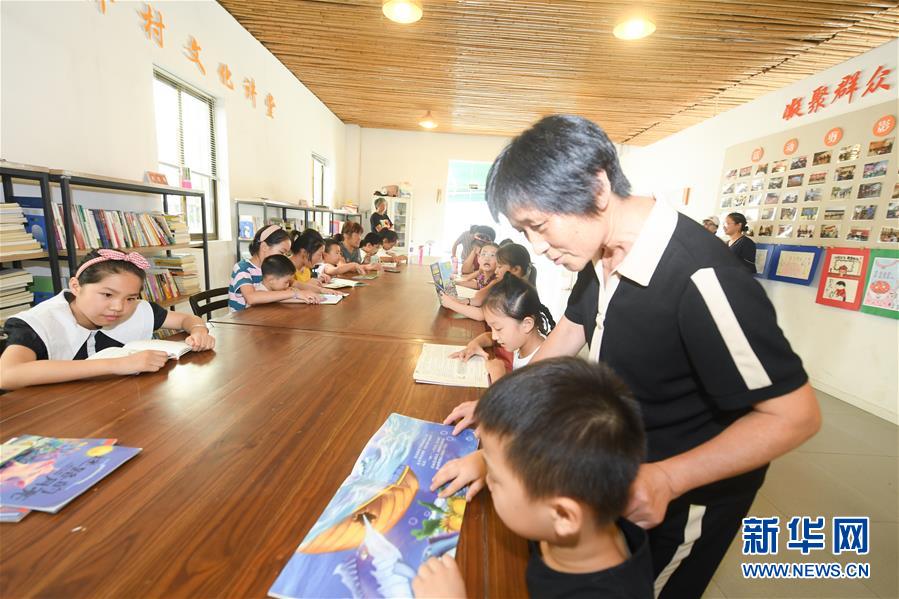 7月30日,郭文英(右)在栎桥村文化礼堂带领儿童阅读。 新华社记者 翁忻旸 摄