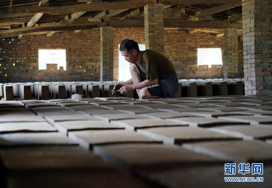 7月30日,河北省任丘市出岸镇古建砖厂工人在制作砖坯。 新华社记者 牟宇 摄