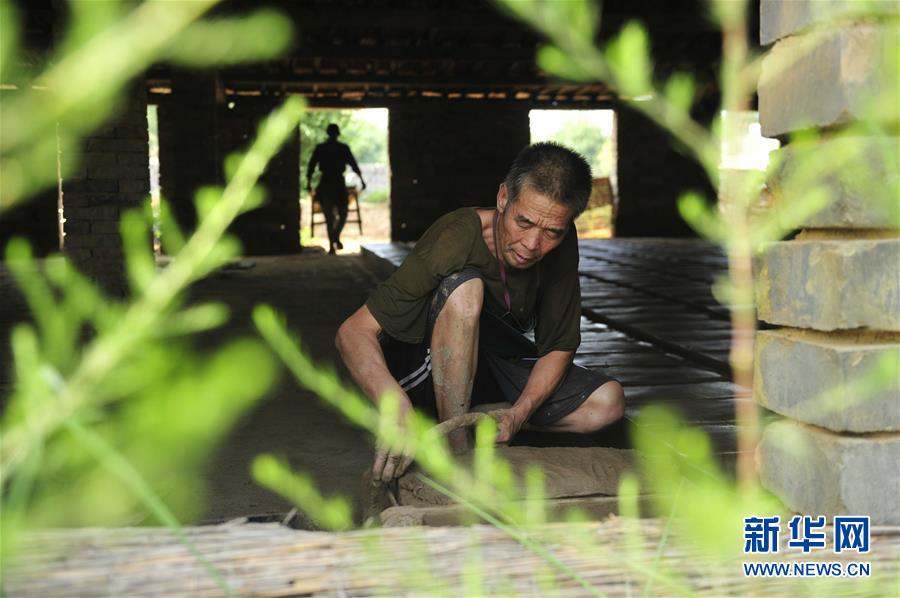7月30日,河北省任丘市出岸镇古建砖厂工人在制作砖坯。 新华社记者 牟宇 摄
