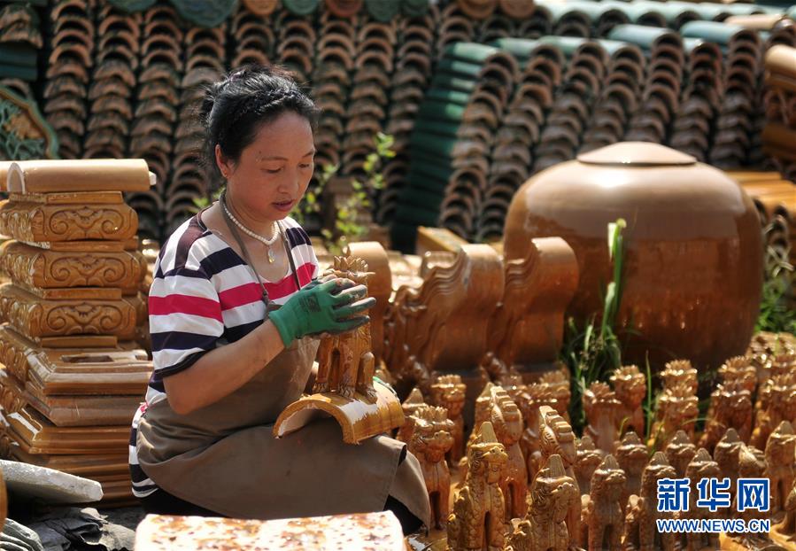 7月30日,河北省任丘市出岸镇古建砖厂工人在整理制作的仿古建筑装饰物。 新华社记者 牟宇 摄