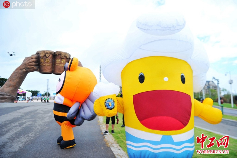 2020年7月31日,山东青岛西海岸新区金沙滩啤酒城,卡通吉祥物在开城仪式上巡游。图片署名: 俞方平/IC photo